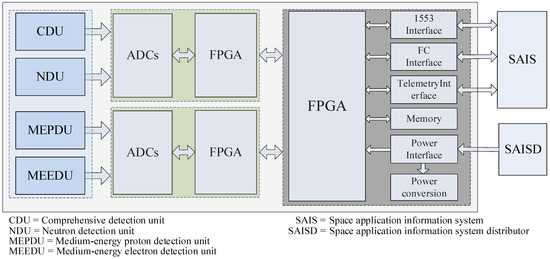 The detection data are sent to the space station platform by being downloaded through the FC-AE-1553 bus line. To achieve the purpose of fast guarantee during data processing, the data packets are divided into quick-view data and level-I data. The quick-view data includes typical space particle environmental data that are harmful to the space station, such as dose rate and high-energy proton flux. Level-I data maintain the initial information of the particles to the greatest extent and can be analyzed in more detail on the ground after downloading. All the data are sent to the scientific personnel. After quick-view analysis and preliminary processing of the data, the working status, that is, the working mode and threshold of the instrument, can be adjusted. The schematic diagram of the EPD’s electronics principle is shown in Figure 10.