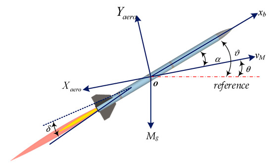 As can be seen in Figure 3, which gives a schematic of the missile in the pitch plane. denotes gravity. and denote the aerodynamic drag and the lift force of the missile, respectively. In addition, represents the attack angle.
