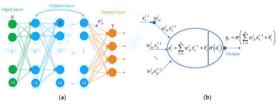Like other neural networks, the deep neural network also consists of an input layer, a hidden layer, and an output layer. In hidden layers, each neuron is fully connected, meaning any neuron in hidden layers must be connected with any neuron in hidden layers and . According to the specific problem, we can construct the appreciate networks with different hidden layers. As shown in Figure 5a, denotes the input vector, and is the th element of . represents the weight from the th neuron in the th hidden layer to the th neuron in the th layer. denotes the output vector, as can be seen in Figure 5b, which gives the computational structure of neurons. denotes the th neuron in the th layer. denotes the th bias in the th layer. is the neuron output. denotes the activation function, whose input is . To improve the convergence speed, is defined as follows: