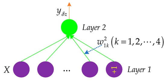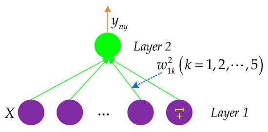 As can be seen in Figure 7, the input vector is defined as and the . Then, the output of the neural network can be written as follows.