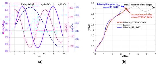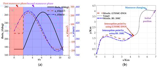 Figure 13 presents the maneuverability of the target and the trajectory of the missiles and the target. In Figure 13a, it is clear that the target adopts variable maneuvering speeds before 2 s, while the target suddenly takes a large-angle maneuver at 2 s. Even so, the missile can still intercept the target. In terms of interception time, the missile can intercept the target earlier by using the GTSMC-DNN method, which can also verify the design objectives mentioned in Section 3.1.