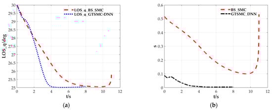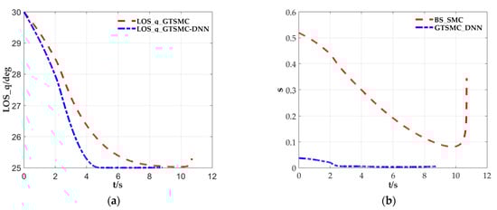 Figure 10a,b gives the variation of LOS angle and the sliding mode surface. It is clear that the LOS angle can be converged to the desired angle earlier by using GTSMC-DNN method. This also verifies Remark 1 and the first design objective mentioned in Section 3.1. Additionally, although the LOS angle can also be converged to the desired angle by using the BS-SMC method, the LOS angle becomes divergent gradually, especially when approaching the target.