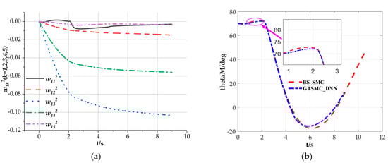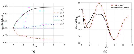 Figure 11 gives the variation of the adaptive weight parameters of DNN and the trajectory inclination angle. It is obvious that the amplitude of is relatively smaller when using GTSMC-DNN. Additionally, the system state curves change more violently when using the BS-SMC method, which verifies the second design objective mentioned in Section 3.1. As shown in Figure 11a, it is clearly that the adaptive weight parameters of DNN gradually converge to a fixed value. Thus, all these phenomena show that using the GTSMC-DNN method proposed in this paper can have a better control performance, which can also verify the design objectives mentioned in Section 3.1.