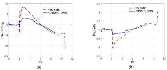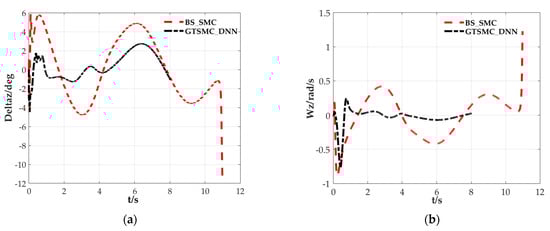Figure 12 shows the variation of the rudder deflection angle and the pitch angular rate. It is clear that the rudder deflection angle is relatively smoother, and the amplitude is smaller when using the GTSMC-DNN approach. This demonstrates that using the GTSMC-DNN approach can have a better control performance. In addition, Figure 11b shows the variation of the pitch angular rate. Compared with the BS-SMC method, the amplitude of the pitch angular rate is relatively smaller and smoother. Furthermore, the convergence speed of the rudder deflection angle and the pitch angular rate is relatively faster by using GTSMC-DNN.