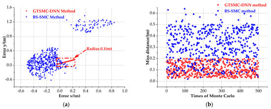 Figure 17b provides the miss distance for each time. It is obvious that all these impacting points are less than 0.2 m, using the GTSMC-DNN method. This also reflects that the method has a higher interception accuracy.