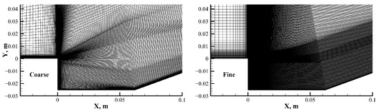Schematic diagram of grid spanwise section of the Settles supersonic flow (left: coarse, right: fine).