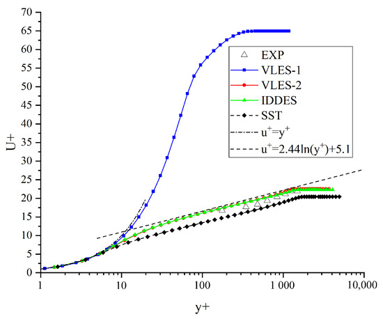 For the validation, the time-averaging streamwise velocity distributions at each section in the numerical simulations and experiments were compared first. All the mean profiles below were obtained by time and spanwise averaging. The first section was located mm in front of the cavity, belonging to the fully developed turbulent boundary layer region. Figure 3 shows the comparisons of the mean velocity profiles for this section with the height and velocity normalized in wall units. It can be observed that the velocity distribution in the VLES-1 simulation results showed a too-thick linear distribution region, similar to LES results in over-sparse anisotropy wall grids. This was due to the large aspect ratio of the grids, which could lead to the underestimation of the length scale, resulting in insufficient turbulent viscosity from the LES mode, while the resolving rate of the turbulent kinetic energy was low. Although the differences in the boundary thickness were insignificant, a significant mismatch in the velocity distribution law of the flat-plate boundary layer could lead to poor predictions of the shear layer downstream. In contrast, the IDDES, VLLS-2, and SST turbulence models produced mean velocity distributions in good agreement with the standard boundary layer theory. However, the SST model predicted a slightly lower transition position of the logarithmic law, suggesting that the RANS-predicted turbulent viscosity was too large, resulting in the overprediction of the velocity shear on the wall and a slightly thinner boundary layer.