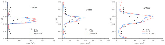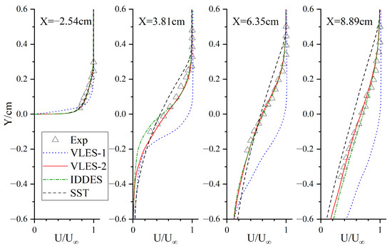 Figure 4 shows the profiles of the mean velocity normalized by the inflow velocity m/s at four cross-sections of the different turbulence models, including SST, IDDES, VLES-1, and VLES-2, compared with the experimental data. The thickness of the boundary layer at the first location in the experiment was about mm, and the numerical simulation results were in good agreement with the experiment, except for the VLES-1 results. In this section, the attenuation of the turbulent viscosity away from the wall predicted by VLES-1 was too fast, as was also described in the paragraph above. This was mainly caused by the bad estimations of the anisotropic grids’ length scales. In the boundary layer region of the flat plate in front of the cavity, the grid was only densified in the direction perpendicular to the wall. This kind of grid is suitable for the RANS, but cannot resolve most of the velocity fluctuations for the LES. Benefiting from the appropriate grid truncation scale, the IDDES method mainly uses the RANS turbulence mode in this kind of wall grid. However, the volume-averaging length scale in the original VLES method is not suitable for the anisotropic grid near the wall, and the premature reduction of the turbulent viscosity easily leads to insufficient modeled stress. For the velocity distributions of the three cross-sections in the shear layer, the results of the IDDES model were in good agreement with the experimental results. Due to the high turbulence viscosity of the SST model, the flow velocity changed too slowly with the increase in height, but the center position of the shear layer was roughly the same as that of the experiment. In VLES-1, the shear layer developed toward a lower direction. This was mainly caused by the deviation in the velocity profile in the flat-plate boundary layer.