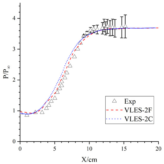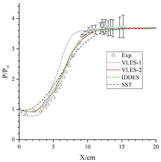 Figure 5 shows the distributions of the averaging wall pressure normalized by the inflow pressure 21,222.23 Pa and the experimental data with error bars. The final pressure peak on the slope predicted by the numerical simulation was equivalent to that of the experiment. The RANS simulation using the SST model predicted the most forward pressure rise position, the slowest pressure rise speed, and a later position to reach the peak value. The pressure rise position predicted by the VLES-1 model was in good agreement with the experiment, but the slope of the pressure rise curve was too large, and the peak position was also much earlier than in the experiment. This was mainly caused by the development direction of the shear layer being too low. By comparing the results of VLES-1 and VLES-2, we could see that the problem of the pressure curve rising too fast was effectively solved by using a better grid length scale calculation method. The pressure curve predicted by IDDES had the highest consistency with the experiment, within which the pressure rise position, the position of the peak, and the slope of the pressure curve had a high consistency with the experiment.