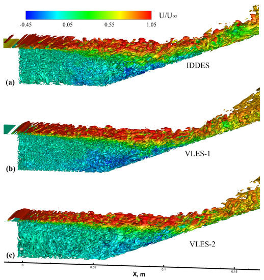 The Q criterion [68] is the second invariant of the velocity gradient tensor, defined as , where S and are the strain rate tensor and vorticity tensor, respectively. The subgraphs in Figure 6 show the isosurfaces of the Q criterion colored according to the dimensionless streamwise velocity from the simulation results using the IDDES, VLES-1, and VLES-2 turbulence models from top to bottom, respectively. Roughly speaking, the results of IDDES retained the vortex structure of larger scales at the initial stage of the shear layer compared to the VLES results. For the results of VLES with the improved hybrid length scale in particular, the K-H instability phenomenon in the shear layer was effectively captured from a more forward position. Comparing the VLES results using the two different length scale estimations, there was no significant difference between the averaging scales of the vortex in the shear layer. However, it could be seen that in the VLES-2 results, the large deviation in the predicted development direction of the shear layer greatly was improved. The improved VLES results included vortexes with larger scales generated with a higher position in the latter half of the shear layer close to the reattached boundary layer. In addition, the vortex scale in the cavity from the VLES-2 results was slightly larger than in the original VLES-1 results, which indicated that the modified subgrid length scale in the region of near-isotropic turbulence was larger than the volume-averaging grid scale, because the grid scale in the spanwise direction was large. As for the reattached boundary layer region, there was no significant difference between VLES-1 and VLES-2, while the scale of the vortex structure predicted by IDDES was significantly larger than that of VLES.