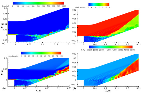 Contours of (a) turbulent kinetic energy, (b) viscosity ratio, (c) Mach number, and (d) static pressure from the IDDES results.