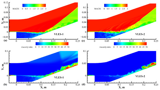 Contours of Mach number and viscosity ratio from the VLES results: (a,b) VLES-1, (c,d) VLES-2.