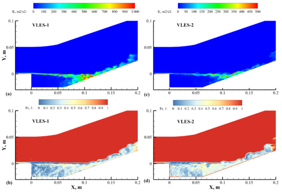 Contours of turbulent kinetic energy and resolution control function from the VLES results: (a,b) VLES-1, (c,d) VLES-2.