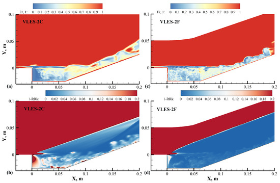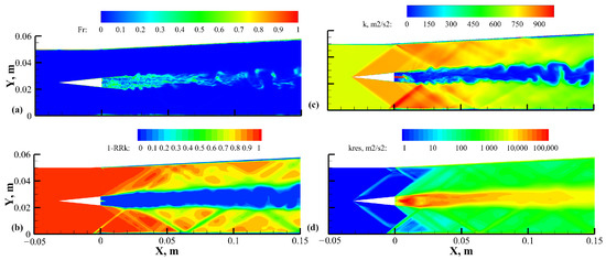 To further reveal the adaptive adjustment ability of the resolution control function for the resolvable turbulent kinetic energy , the contours of and the unresolved ratio of the turbulent kinetic energy are shown in Figure 13, where the resolved ratio of k was calculated in the simulations by time averaging, as follows: