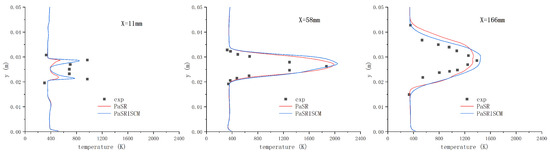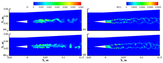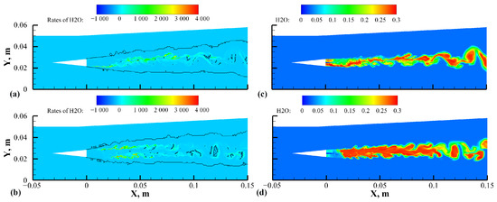 where represents the subgrid mixing timescale, and is the chemical reaction timescale, which can be understood as the ratio of the molar concentration to the weighted average of the molar production rates of each reaction [54,55,56]. The details of the calculation process of are shown in Appendix A, and the formula for the turbulent Mach number was provided in Section 2.2 for the compressibility correction of the SST model.