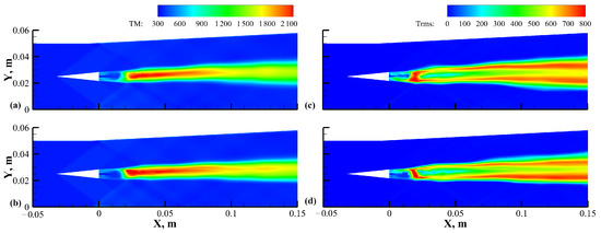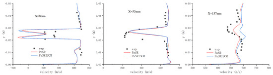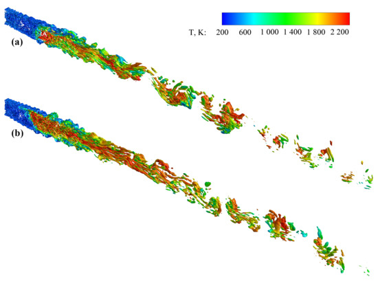 To obtain a suitable initial field, the SST model with compressibility correction was used to obtain the steady RANS result. The LUSGS method was used for the time advance of all equations. The local CFL number was set to 50 for the RANS simulation, while in the hybrid RANS/LES simulations, the global maximum CFL number was set to 15, and the corresponding time step was about s, which was similar to that employed by many researches using implicit second-order time-advancing methods [66,67]. For the time averaging of the unsteady hybrid RANS/LES simulations, about 0.1 million time steps were calculated for about eight flow penetration periods.