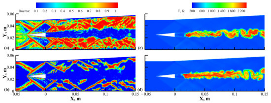 Besides the turbulence model, the discretization scheme is another important factor in the ability to capture small flow features. In numerical simulations involving strong discontinuity such as shockwaves, total variation diminishing (TVD) schemes are always used to avoid numerical oscillations and improve the robustness of the simulation. However, additional numerical viscosity is always induced by the gradient limiters of the TVD-based schemes. In contrast, the high-order central schemes with lower dissipation are better at capturing the flow structures of small vortices but are less unstable around the shockwaves. For this reason, many shock-capturing functions for low-dissipation blending schemes, such as the Harten switch [36], Pirozzoli switch [37], Ducros sensor [38], and Hill–Pullin shock sensor [39] have been proposed for distinguishing the shockwave regions. Among these methods, the Ducros blending function is easy to calculate and performs well in simulations of supersonic flows with shock/boundary interactions [9,10]. However, the expansion fans can also be judged as the TVD region under the original Ducros sensor, which may bring additional dissipation to the heat-release regions with high expansion rates in combustion cases.