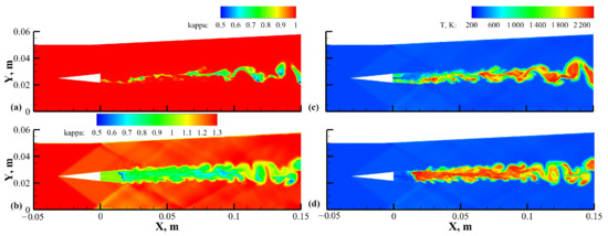 Throughout the entire flow path of a scramjet, unsteady phenomena have significant implications for many flow and flame characteristics, such as intermittent ignition events, vortex dynamics, and shock/boundary/flame interactions. As a result, a high-fidelity numerical simulation is necessary to uncover the intricate physicochemical couplings between chemical kinetics and supersonic flows. However, for industrial applications, computationally resolving all the relevant spatial-temporal scales in high-speed compressible reactive flows, especially for the boundary layers, is unaffordable when employing a wall-resolved large eddy simulation (LES) method [7], not to mention the direct numerical simulation (DNS) method. In this situation, the limitations of Reynolds-averaged Navier–Stokes simulations (RANSs) and the excessive computational expense of a wall-resolved LES make the use of the hybrid turbulence methods a compromise [8]. Some prior work in applying hybrid RANS/LES methods for simulations of high-fidelity supersonic turbulent combustion has been reported [9,10,11], wherein the boundary layers along with the vortex from the mixing layers were adequately resolved.