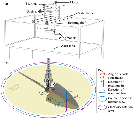 A one-degree-of-freedom experimental revolving wing rig, schematically presented in Figure 1, was used to collect the measurements in this study. The experimental rig consisted of a 1480 mm × 990 mm water tank that hosted the experiments. Wing models were mounted axisymmetrically, as shown in Figure 1b, and were driven by a servo motor (model: Dynamixel MX64-AT) mounted concentrically within the main rotating shaft, meaning the output of the servo motor drove the wing models at the same rate without the need for additional mechanisms such as belts and gears. Given that the water tank was rectangular in shape, the shorter side (990 mm) was considered for wall effects to inform the maximum size of the wing models. Manar and Jones found no wall effects for tip clearances between the wing tip and walls of 5–7 chord lengths up to a Reynolds number of 10,000 within the first two revolutions [48]. This value was used in the first iteration of the design for our wing models. Once manufactured, our own validation tests found that no wall effects were present for all wing models within the first three full revolutions, shown later when discussing force histories.