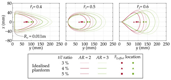 Wing planform dimensions for different aspect ratios, wing area centroid locations, and thickness-to-chord ratios. values are used as the characteristic length scale for aerodynamic characterization, e.g., Reynolds number and force coefficient calculations. Due to symmetry consideration, only one side of the propeller-like wings is shown.