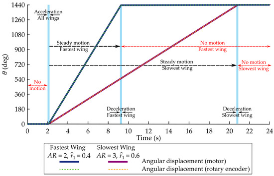 A 12-bit rotary encoder embedded in the servo motor allowed precise actuation of the revolving wing models. The acceleration range of the servo motor ranged from 0 to 2180°/s2. For each experimental run, the two axisymmetric propeller-like wing models were accelerated, from rest, at an acceleration of 1004°/s2 that ramped the servo motor to allow the wings to reach its steady rotational frequency (). This acceleration value, obtained via extensive tests, was deemed sufficiently high to capture the transient signals in the inertial dominated region, but also not too high to overload the force sensor. The angular displacement profiles for the fastest and slowest moving wings (by rotational frequency) are shown in Figure 3.