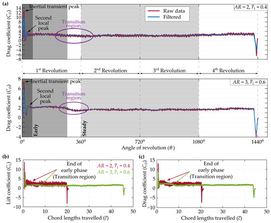 Force histories in the fourth revolution were truncated prior to data analysis. However, as shown in Figure 4, a slight increase in the drag coefficient during the fourth revolution is evident and this is likely a result of LEV and tip vortex interaction as well as possible tip vortex suppression [69,70,71]. Note that the size of the wing models was carefully monitored to ensure sufficient tip clearance from the tank walls to wing tips within the first three revolutions. The decision to revolve the wing models for a full fourth revolution ensured that the deceleration region was not captured. Furthermore, this choice meant that for three revolutions of the wing models the lift and drag coefficient histories were free from wall effects. Finally, it is worth mentioning that the differences in the observed signal-to-noise ratios between the two wings shown in Figure 4 can be attributed to the rotational frequency and resulting force magnitudes of each wing. However, as discussed previously, the standard deviation for all measurements was no greater than 3.3% of the mean between repeat tests.