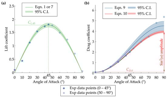 Within the literature, e.g., [73], the drag coefficient relation has also been expressed in terms of both and , which are the drag coefficient values at 0° and 90° angles of attack, respectively, as follows: