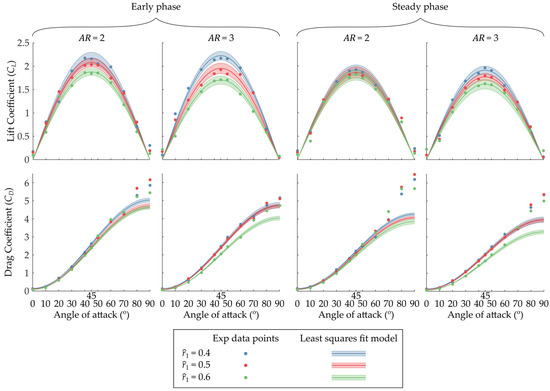 In this section, the wing planform effect will be presented via demonstrating the variation of the lift and drag coefficients throughout the first quadrant of angles of attack. However, more discussions on the variation of the lift curve slope and the zero-lift drag coefficient (the two key parameters required to define the normal force model) against aspect ratio and area centroid location will be presented in the following sections in conjunction with the effects of Reynolds number and thickness-to-chord ratio. Figure 6 shows the measured lift and drag coefficients (represented with circle markers) together with the least squares fit models for all wing planforms considered at a Reynolds number of 10,000 and thickness-to-chord ratio of 5%. Clearly, a monotonic decrease in the lift coefficient with the increase in the area centroid location is apparent. This observation agrees with previous analytical studies [13,72] that suggest that, for a revolving wing not experiencing any form of stall, the maximum obtainable lift coefficient increases with a decrease in area centroid location. For each configuration, and as expected from the time histories of force coefficients previously discussed, the early phase consistently exhibited higher force coefficients than that of the steady phase.