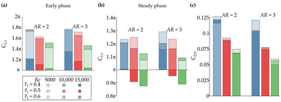 Stacked bar chart showing the variation of (a) from early measurements, (b) from steady measurements, and (c) with area centroid location, , aspect ratio, , and Reynolds number, .