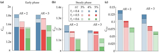 Stacked bar chart showing the variation of (a) from early measurements, (b) from steady measurements, and (c) with area centroid location, , aspect ratio, , and thickness-to-chord ratio, .