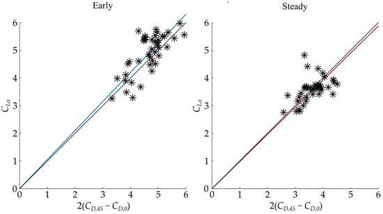In this section, we attempt to demonstrate that the lift and drag parameters within the normal force model are indeed related. Figure 9 provides such a demonstration using the experimentally measured lift curve slope, zero-lift drag coefficient, and drag coefficient value at 45° angle of attack, with all these three parameters being extracted based on the least squares fit method discussed in Section 2.3. All measurements for the different cases (various planforms, thickness-to-chord ratios, and Reynolds numbers) considered are on or close to the solid black diagonal line where our proposed relation between the lift and drag parameters is satisfied. In fact, the slopes of the best fit lines presented via the solid blue and red lines shown in Figure 9 are 1.05 and 0.98 for the early and steady measurements, respectively, showing satisfactory equivalence between and . This demonstrates that the normal force model (hence the formation of a stable LEV that leads to prevention of stall) is established for the cases measured. However, a more interesting conclusion from this illustration, despite its simplicity, is that with the values of and being solely measured/known, the values of both the lift and drag coefficients within the first quadrant of angle of attack become fully defined.