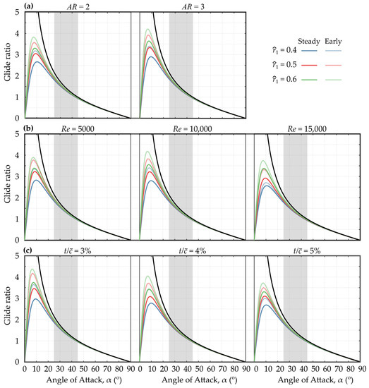 Figure 10 shows the variation of the glide ratio for the different wing morphologies, Reynolds numbers, and thickness-to-chord ratios from early and steady measurements. To demonstrate each effect independently, averaged plots are presented in Figure 10. For example, in Figure 10b, values of the lift curve slope and zero-lift drag coefficient used to inform the plots are averaged for the different aspect ratios and thickness-to-chord ratio cases involved.