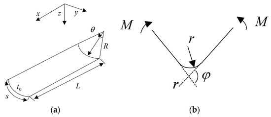 The bending process of the tape spring is shown in Figure 3, where Figure 3a shows the geometric parameters and Figure 3b shows the curvature radius r and rotation angle θ when a bending moment M is applied.
