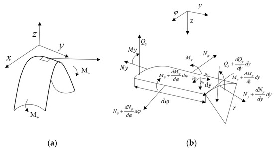 The deformation and coordinate system after bending and folding is shown in Figure 4a, with the coordinate system established in the initial state, where the generatrix direction is the x-axis. Taking a small element on the symmetric centerline of the folded and bent structure and drawing its internal force diagram, the coordinate system remains consistent with the initial state, as shown in Figure 4b, where is the normal force and moment in the φ-direction; is the normal force, moment, and transverse force in the y-direction; and is the strain in the φ- and y-directions.