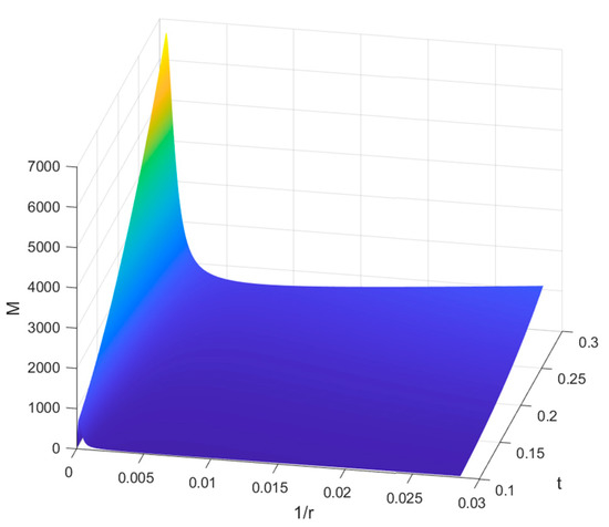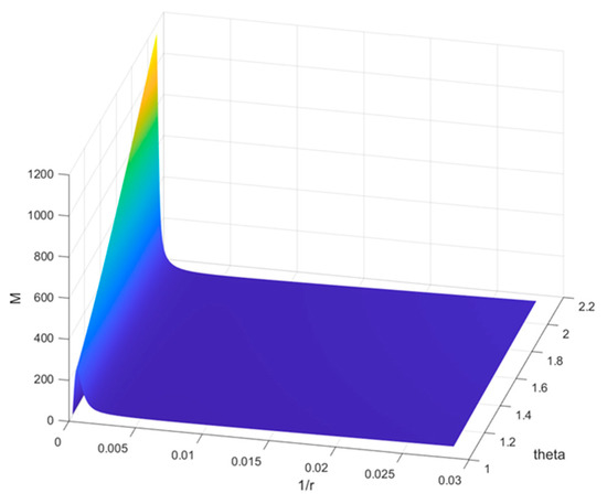By taking L = 350 mm, R = 35 mm, , and , we can substitute the model parameters into Equation (25) to obtain the variation in curvature radius–bending moment during the reverse bending process of the tape spring structure with different central angles and thicknesses, as shown in Figure 6 and Figure 7. For Figure 6, the x-axis represents the reciprocal of the curvature radius, the y-axis represents the central angle, and the z-axis represents the bending moment. It can be seen that the critical bending moment of the open-ended cylindrical shell tape spring increases significantly with the change in the central angle θ. In contrast, the steady-state bending moment remains relatively stable. For Figure 7, the x-axis represents the reciprocal of the curvature radius, the y-axis represents the thickness, and the z-axis represents the bending moment. With the change in thickness t, the critical bending moment of the open-ended cylindrical shell tape spring increases significantly, and the steady-state bending moment also increases significantly.