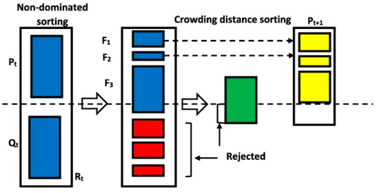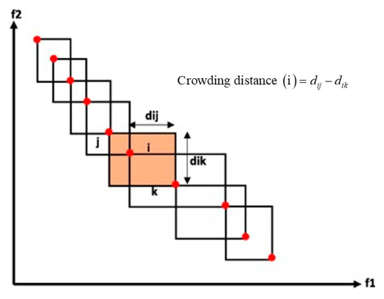 Multi-objective optimization has wide applications in multiple fields, such as engineering design, scientific computation, economics, and biology. Multi-objective optimization methods can help us find a set of solutions that meet all objectives optimally in complex environments and achieve a balance between objectives. The NSGA-II is a commonly used multi-objective genetic algorithm and an improved version of the NSGA algorithm. Figure 10 illustrates the structure of the NSGA-II algorithm, which is designed to find the optimal global solution in multi-objective optimization problems. The algorithm incorporates non-dominated sorting technology based on genetic algorithms, which divides the non-dominated levels of individuals in the population to ensure solution diversity in the population [55]. First, the NSGA-II algorithm performs non-dominated sorting to divide the population solutions into layers. Reproduction and mutation operations are carried out on each layer, and the diversity of solutions between layers is maintained using the roulette selection algorithm. The population is then updated and selected through non-dominated sorting and the crowding distance index. In addition to these, the algorithm employs mutation and crossover functions [55]. Among these functions, the crossover is considered the most important in the NSGA-II algorithm [56]. In multi-objective optimization problems, the crossover function is responsible for producing new offspring by merging genetic information from two parents, while the mutation function plays a crucial role in preserving genetic diversity between current and future generations of the population, ultimately leading to the discovery of the optimal global solution [57]. The crowding distance function, as depicted in Figure 11, plays a key role in ensuring diversity and facilitating the selection of solutions in the population.