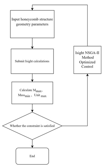 Lightweight optimization design should not only pursue the minimum quality but also ensure the minimum quality while guaranteeing sufficient mechanical properties of the tape spring. Therefore, the NSGA-II algorithm is used for multi-objective optimization design. From the moment expression (40), it can be seen that the magnitude of the bending moment is not only related to the curvature radius r but also to the material parameters E and v, as well as the size of the honeycomb cells. Therefore, we will conduct research on honeycomb cells. This article takes the steady-state bending moment M, honeycomb mass Mass, and unit bending moment value Unit as the objective functions for optimization, with the geometric parameters of the honeycomb structure tape spring as the design variables. The optimization process is shown in Figure 12. For ease of calculation, the honeycomb mass is taken as the mass of a single cell, with a density of unit density. According to (1), (2), and (39), the optimization model of the auxetic re-entrant honeycomb tape spring can be obtained as follows.