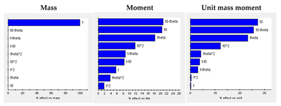 Figure 13 shows the Pareto chart obtained during the optimization process, which reflects the percentage of contribution of each item in the fitted model to each response. It can be seen that the honeycomb inner wall thickness t0 has the greatest influence on the bending moment, followed by .