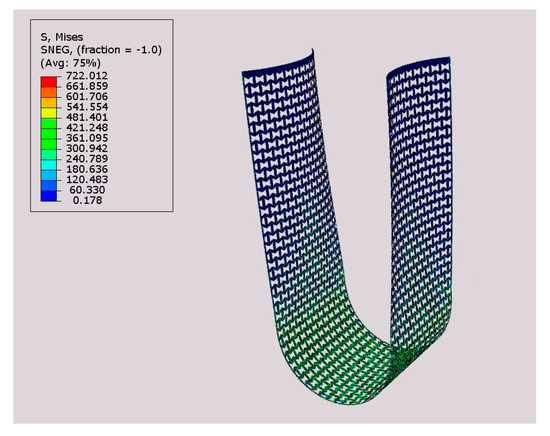 After optimization analysis, in order to verify the correctness of the optimization analysis, the reverse bending process simulation was performed using ABAQUS software by creating a finite element model with shell element S4R5. In order to ensure that the space-deployable mechanism model can achieve a purely bending state during actual operational processes, we used MPC constraints to establish nodes on both ends of the model, with the centroid of the end face serving as the control node and coupled them as MPC constraints. In the ABAQUS finite element software, we applied boundary conditions at the end face’s centroid to simulate the bending moment’s loading effect. We used the ABAQUS automatic meshing feature, with an approximate global size of 0.5 mm and a maximum offset factor of 0.1 for curvature control. We also set the minimum size control as a proportion of the global size, with a factor of 0.1. In the finite element analysis process, we employed a large non-linear deformation (NLGEOM) incremental analysis using a solution on which the method was based on. The automatic stabilization coefficient STABILIZE was set to 0.0002. The boundary conditions with applied displacement constraints were as follows: among the six degrees of freedom on one end face of the model, the X-direction displacement, Y- and Z-direction displacements, and rotations were constrained, and an X-direction rotation of 1.57 radians was applied, i.e., an X-direction rotation of 1.57 radians was applied while the other five degrees of freedom were constrained. For the other end section, the X- and Y- direction displacements were constrained, the Y- and Z- direction rotations were constrained, and an X-direction rotation of −1.57 radians was applied. This application could make the model bend into a U-shape, which was consistent with the actual working state of the space unfolding mechanism. The model dimensions are shown in Table 4. The boundary conditions are shown in Table 5. The FEM model is shown in Figure 14.