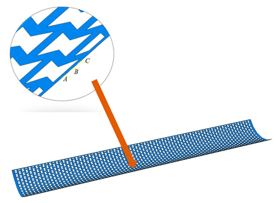 Figure 15 displays the finite element model of the Auxetic re-entrant honeycomb tape spring after bending. In the finite element model, at the mid-point of the shell, as shown in Figure 16, the adjacent three points A(x1,y1), B(x2,y2), and C(x3,y3), are taken. Assuming that the coordinates of the three points are known, the curvature radius r during the bending process of the tape spring can be calculated by Formula (42)