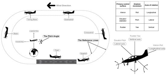 The flight dynamics data were automatically recorded by the VR simulation software. The raw variable included: (a) timestamp in seconds; (b) the gesture of the airplane measured using Roll, Pitch, and Yaw (Heading); (c) the location of the airplane, including longitude, latitude, above ground level (AGL), and above sea level (ASL); (d) flight movement measurements, including velocity and angle of attack (AoA); (e) control device inputs, including rudder, elevator, and roll inputs; and (f) the (longitude, latitude, and height) of the nearest point on the center of the two reference lines.
