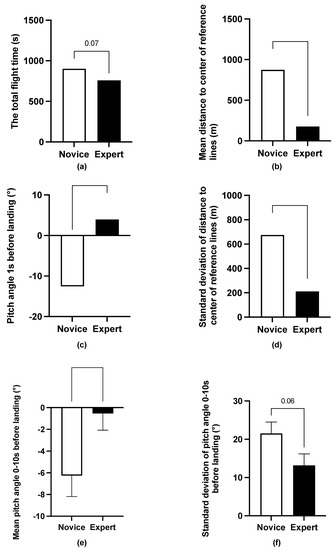 Means and data distribution of flight performance between novices and experts: (a) The total flight time (s); (b) Mean distance to center of reference lines (m); (c) Pitch angle 1 s before landing (°); (d) The standard deviation of distance to center of reference lines (m); (e) Mean pitch angle 0–10 s before landing (°); (f) Standard deviation of pitch angle 0–10 s before landing (°). Note: Error bar represents SEM, * represents p < 0.05, and *** represents p < 0.001.