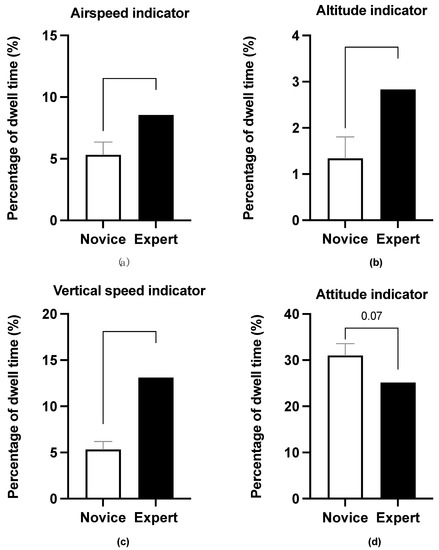 As shown in Table 5 and Figure 4, experts spent a significantly higher percentage of time than novices on the key flying instruments (i.e., airspeed indicator, vertical speed indicator, and altitude indicator): the airspeed indicator (t(44) = 2.11, p < 0.05, Cohen’s d = 0.64), the vertical speed indicator (t(44) = 3.83, p < 0.001, Cohen’s d = 1.15), and the altitude indicator (t(44) = 2.24, p < 0.05, Cohen’s d = 0.68). However, the difference among experts and novices was only marginally significant in the attitude indicator (t(44) = 1.84, p = 0.07, Cohen’s d = 0.56).