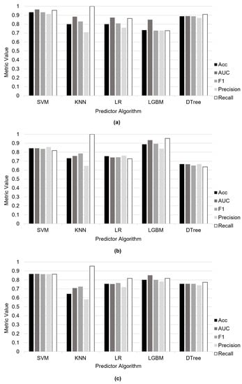 This study adopted five commonly used metrics to evaluate our algorithm, i.e., F1 score (F1), Accuracy (Acc), area under the receiver operating characteristic (ROC) curve (AUC), Precision, and Recall. AUC calculated by the area under the ROC curve is widely used to assess an unbalanced learning performance [50]. Suppose an AUC metric must be labeled as good or bad. In that case, we can reference the following rule-of-thumb from Hosmer and Lemeshow in Applied Logistic Regression (p. 177): 0.5 = No discrimination, 0.5–0.7 = Poor discrimination, 0.7–0.8 = Acceptable discrimination, 0.8–0.9 = Excellent discrimination, and >0.9 = Outstanding discrimination. By these standards, a model with an AUC score below 0.7 would be considered poor, and anything higher than 0.7 would be considered acceptable or better. The confusion matrix is a psychophysics and machine learning concept, especially in Signal Detection Theory. The measurement of the confusion matrix includes FP, TP, FN, and TN, where TP and FN are true positive numbers and false negative numbers, respectively; TN and FP represent the number of true negative and false positive. The formulas of F1, Acc, AUC, Precision, and Recall are as follows: