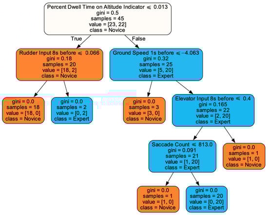 Most of the above-mentioned models (Including SVM, KNN, and LGBM) are not interpretable. Although the SVM + MIC algorithm generated the best accuracy of 0.9333, the DTree model was further analyzed to provide an interpretable model and results for the difference between novice and expert pilots. The DTree had an Acc of 0.8889, an AUC of 0.8893, and an F1 of 0.8889 when using the MIC feature selection method. Figure 8 shows the visualization results of DTree. Thus, when the interpretability of models is emphasized, we need to switch from the best performing SVM + MIC algorithm to DTree and trade 0.9333 − 0.8889 = 0.0444 accuracy for interpretability.
