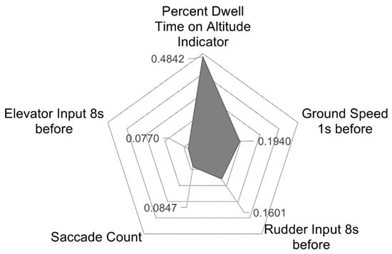 The variables included in the final DTree model include: (1) Percent Dwell Time on Altitude Indicator; (2) Rudder Input 8 s before landing; (3) Ground Speed 1 s before landing; (4) Elevator Input 8 s before landing, and (5) Saccade Count. Figure 9 further depicts the relative contributions of these five variables to the DTree model. Percent Dwell Time on Altitude Indicator contributed most to the DTree model, followed by Ground Speed 1 s before landing, Rudder Input 8 s before landing, next Saccade Count, and Elevator Input 8 s before landing.