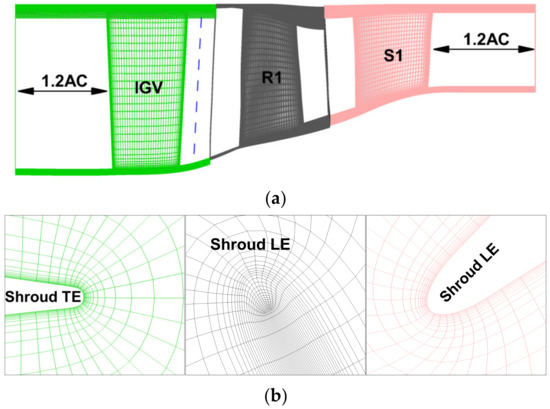 Computational mesh of the 1.5-stage compressor: (a) Single-passage; (b) Blade leading edge (LE) and trailing edge (TE) at the shroud.