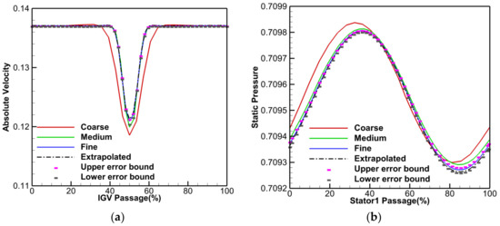 Aerodynamic parameter distribution of three different meshes: (a) IGV exit absolute velocity at 30% span; (b) S1 inlet static pressure at 99% span.