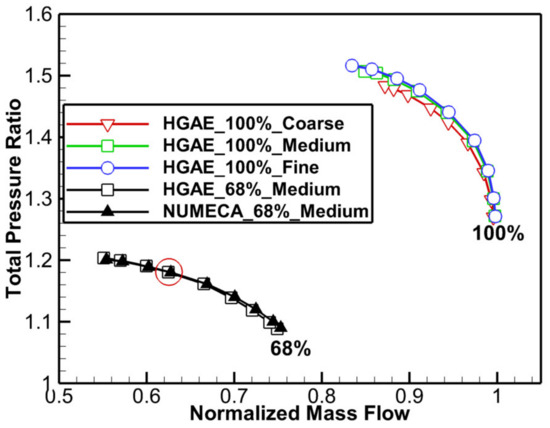 To verify the accuracy of the computational results of the HGAE, steady calculations of the 1.5-stage compressor were also performed using a commercial CFD solver NUMECA based on the same fluid mesh. Figure 4 presents the total pressure ratio against normalized mass flow at 68% rotating speed, the aerodynamic characteristic predicted by HGAE was in good agreement with the results of NUMECA. Moreover, the quantitative comparisons were provided in Table 3, and the errors of the total pressure ratio and the adiabatic efficiency at the peak efficiency (PE) point were 0.042% and 0.148%, respectively, which demonstrates that the HGAE code can provide reliable and accurate computational results.
