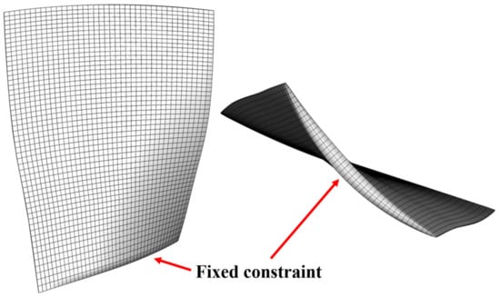 The structured model was discretized by the hexahedral elements with 40 elements chordwise, 53 elements spanwise, and 2 elements in the direction of thickness, respectively, as depicted in Figure 5. The material properties of the rotor blade are shown in Table 2. For the FEA of the rotor blade, the fixed constrained boundary condition was used for the elements at the blade root, and the natural frequencies and mode shapes were obtained from a commercial package ANSYS. Based on the natural frequencies of the first six eigenmodes obtained from modal analyses, the Campbell Diagram is plotted in Figure 2, and the crossing of interest was identified.